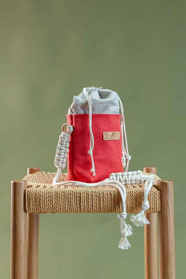 Materiais: cânhamo, tecido deadstock, alça ajustável em algodão orgânico e etiqueta de cortiça