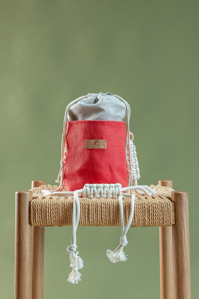 Feita à mão em cânhamo e tecido deadstock, a Mini LULU é 100% natural, biodegradável e sustentável. A alça em macramé de algodão orgânico permite usá-la ao ombro ou a tiracolo.